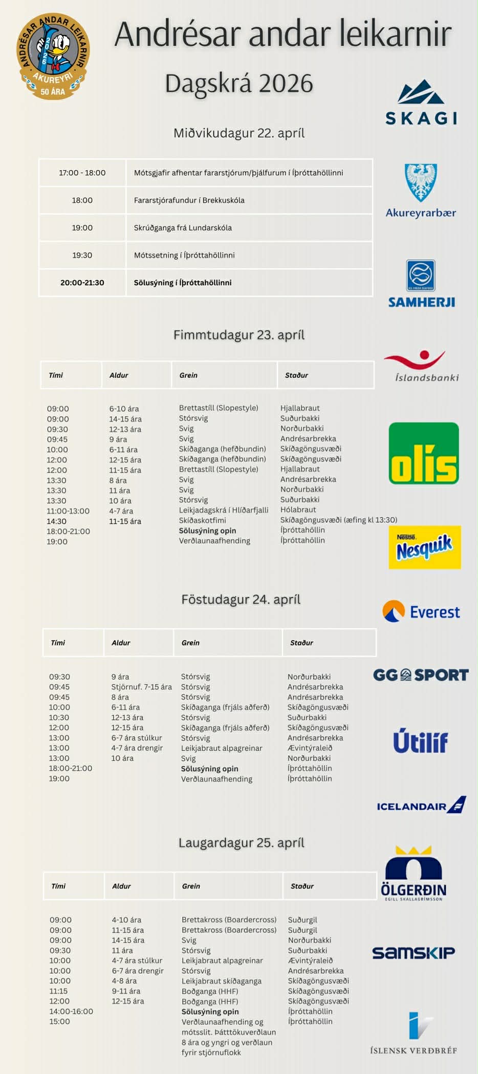 Formleg dagskrá 50. Andrésar andar leikanna