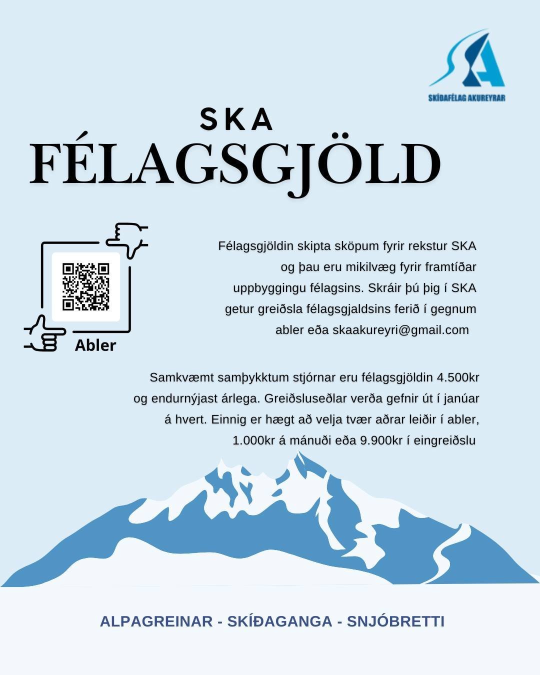 Við hvetjum alla sem vettlingi geta valdið — alla sem bera taugar til SKA, fjallsins og skíðamenningarinnar á Akureyri — til að gerast félagsmenn í Skíðafélagi Akureyrar. Með því styrkirðu beint það frábæra starf sem unnið er, börn, ungmenni, iðkendur, þjálfara og sjálfboðaliða sem halda þessu öllu gangandi.
